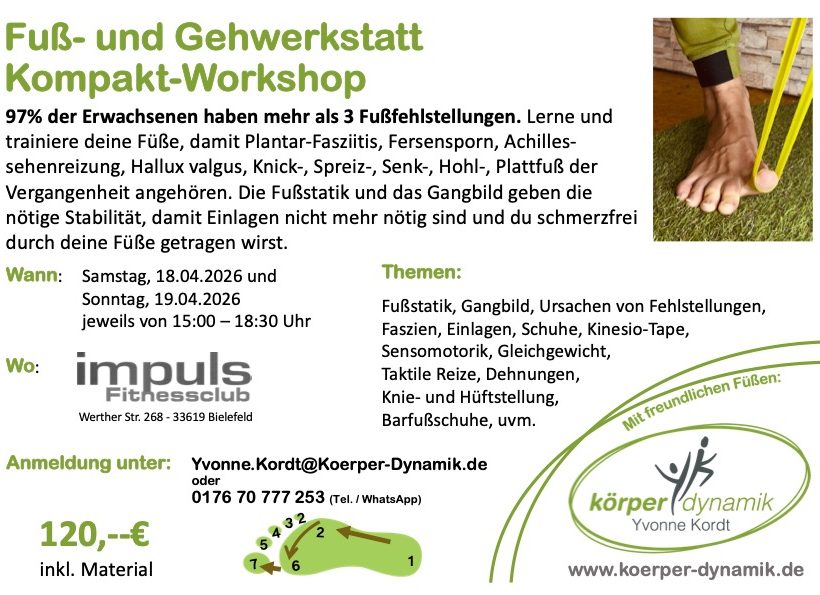 und Knie im Vordergrund. Lerne und trainiere innerhalb von 5 Stunden alles was du wissen musst, damit dich deine Füße schmerzfrei weiter tragen. Du bekommst Wissen, Training, Trainingstools, Schuhberatung, Pausensnacks für 120,–€